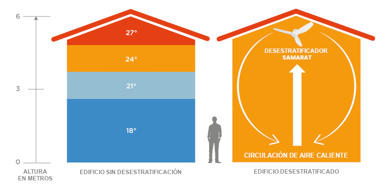 La desestratificación permite homogeneizar la temperatura entre la parte alta y baja del espacio.