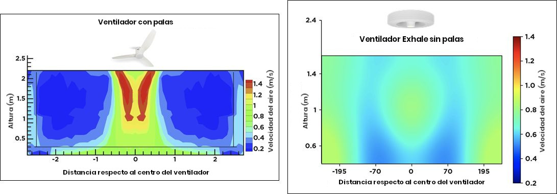 • el ventilador con aspas genera una velocidad de aire elevada justo bajo las aspas; las velocidades disminuyen en cuanto uno se aleja del cilindro vertical definido por su diámetro;