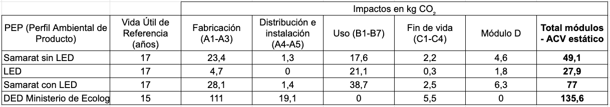 Sobre la misma base, el Samarat sin LED genera un total de 77 kg CO2eq, es decir, 1,5 kg CO2eq de media anual.