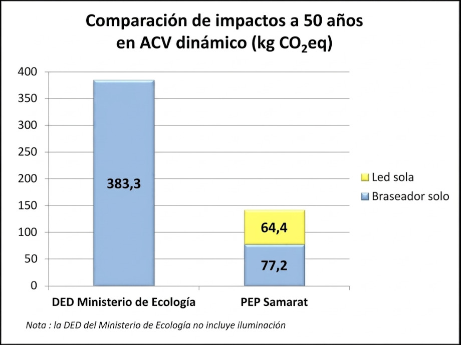 En cuanto al Samarat con LED (sumando ambas fichas PEP ECOPASSPORT), se obtiene un total de 142 kg CO2eq, es decir, 2,8 kg CO2eq de media anual.