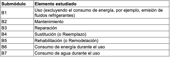 Como se puede ver, el módulo B cubre los impactos relacionados con la fase de uso. La tabla siguiente sintetiza los elementos considerados en los submódulos que componen el módulo B.