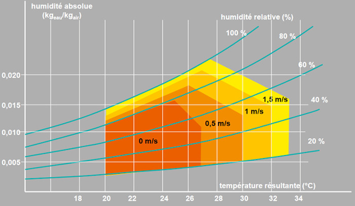 De luchtsnelheid is de parameter waarmee rekening wordt gehouden bij het overwegen van de verbetering van het thermisch comfort. In RE2020 wordt deze berekend op basis van de volgende formule: [Luchtsnelheid] = 0,0032 x [Circulatiesnelheid], waarbij :